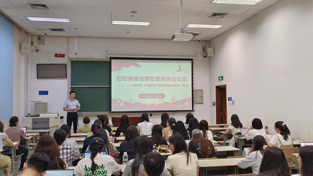 韩锐教授围绕“把纪律建设摆在更加突出位置”这一主题,从《条例》修订的重大意义、精神实质、实践要求等方面入手,对新修订《条例》进行了全面深入地解读。他指出,此次修订是促进全党深刻领悟“两个确立”、坚决做到“两个维护”的必然要求,是贯彻落实习近平新时代中国特色社会主义思想的具体行动,是用严明的纪律管全党治全党的现实需要,是实现纪律规范与时俱进的实践要求。《条例》体现了以严明政治纪律带动各项纪律全面从严、抓“关键少数”和管“绝大多数”相统一、坚持“惩前毖后”和“治病救人”相结合、促进从严管理监督与鼓励担当作为相统一,实现了责任上全链条、管理上全周期、对象上全覆盖、制度上全贯通,有利于让铁纪“长牙”、发威,让党员干部重视、警醒、知止,使铁的纪律真正转化为党员干部的日常习惯和自觉遵循。最后,韩锐教授表示,党的自我革命永远在路上,各位党员要深入学习党的创新理论,不断强化纪律意识;要持续加强党性修养,把讲规矩作为锤炼党性的基本遵循;要坚持以知促行,主动担当作为,努力成为新时代合格的共产党员。