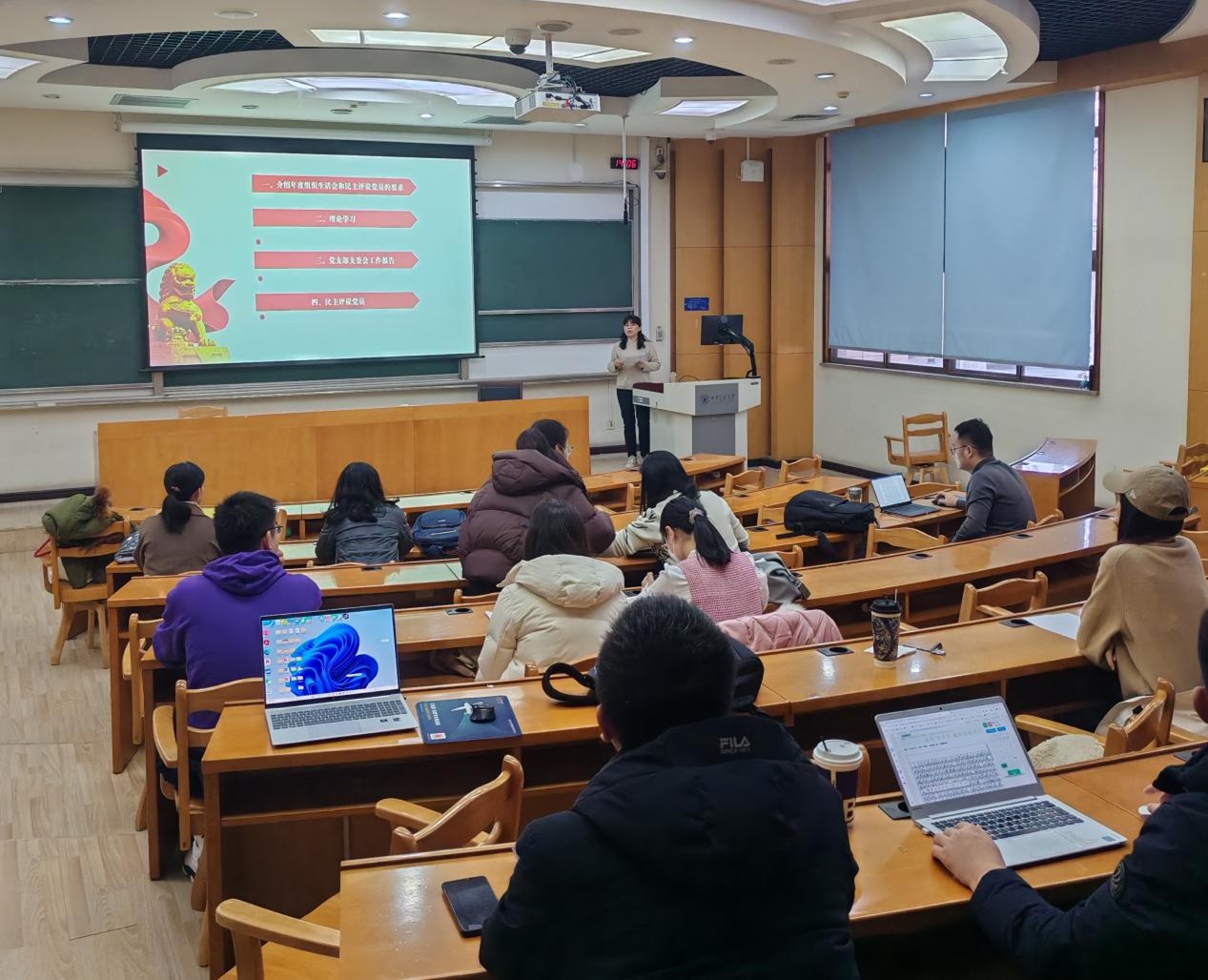 支部书记樊晓燕传达了上级党委关于召开组织生活会、开展民主评议党支部与民主评议党员的工作要求,强调要通过严肃的党内生活,不断增强党员的政治意识、组织意识和纪律意识。接着,她在会上作年度工作报告,总结了支部在强化组织建设、深化理论学习、优化沟通机制、发挥党员先锋模范作用和关爱党员等方面取得的成效,介绍了谈心谈话的内容和成效,并明确了下一阶段的工作方向。在民主评议党员工作环节,支部党员对照评议指标,从党员意识、服务师生、作用发挥、担当作为、作风纪律五个方面对个人表现进行了总结和回顾,联系实际查摆问题,明确了不足和改进措施。在批评与自我批评环节中,党员们紧扣党纪学习教育目标任务,对照党的政治纪律、组织纪律、廉洁纪律、群众纪律、工作纪律、生活纪律的主旨要义和规定要求,开诚布公、坦诚交流,既指出了不足,也明确了整改方向,达到了增进团结、凝聚共识的效果。